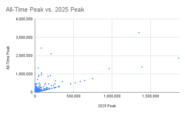 Insights: From this image we can see that very few games remain extremely relevant on steam. Besides the games that were released this year, which follow a 1:1 trend line, the rest of the games have an extreme difference in all-time peaks compared to their peak in 2025. We can also see that besides a few exceptions, the majority of games have an all-time peak lower than 500,000, and a 2025 peak lower than 250,000.