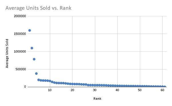 Insights: From this image we can see the exponential trend of rank compared to units sold. The highest rank has more than 1,500,000 units sold, while the next highest has just over 1,000,000. By the 5th rank, the units sold has decreased substantially, estimating at around 250,000. The next few ranks are very similar, with very little change in this decreasing trend.